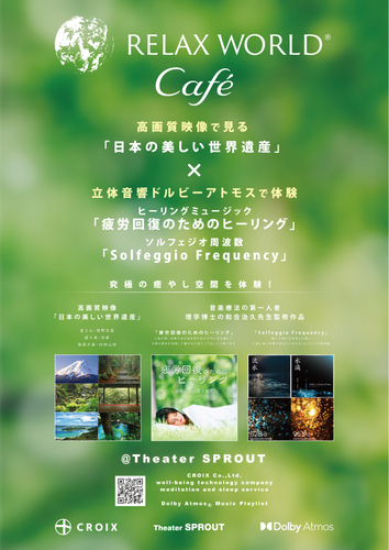 浅草・かっぱ橋道具街にあるレンタルスペース「Theater SPROUT(シアタースプラウト)」(運営会社:株式会社Budscene 、本社:東京都台東区、代表取締役:並木勇一)は、Dolby Atmos®(ドルビーアトモス)対応の7.1.4chの立体音響と、165インチ巨大スクリーンで映画を楽しめる最大30名収容のレンタルプライベートシアターです。去年から好評いただいている、株式会社クロア( https://croix.asia/ )とコラボレーションしたヒーリング✖️シアターカフェ「RELAX WORLD Café」を「かっぱ橋道具まつり2023」でも新たな装いで開催いたします。10月7日(土)から10月9日(月・祝)の3日間、カフェ"sensing-touch-of-earth"(センシング・タッチ・オブ・アース)2階のシアターでは、高画質4K映像で見る日本が誇る美しい世界遺産の貴重な映像に合わせ、Dolby Atmosの立体音響を耳だけではなく全身で体感する事が出来るヒーリングミュージック、さらには心も癒すアロマの香りの効果を加え、音、映像、香りの3感による癒やしの没入感が味わえる唯一無二のカフェタイムをご提供致します。“プロを支えるプロの街、かっぱ橋道具街”でのお買い物の休憩に、癒しのプロと空間音響のプロが創る特別なシアターへお越しください