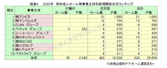 2025年中に開設した有料老人ホームの事業主体別ランキングにおける上位事業主体の多くは、㈱アンビスや㈱サンウェルズ、CLAN グループ(緩和ケアホーム・ブランド「アルク」)、シーユーシー グループ、㈱スタッフシュウエイ、㈱エクラシア、㈱リベルケアといった緩和ケアホームの運営事業者となっている。ランキング1位の㈱アンビスは「医心館」ブランドのホームを21ヶ所/1,065戸開設し、2位の㈱サンウェルズも「PDハウス」ブランドを12ヶ所/704戸開設する等、速いペースで開設を進めている。両社は以前より、速いペースで開設を進めていたが、昨年から今年にかけ、コンプライアンス上の問題が報道された。それによって事業構造の一部見直しを迫られたが、今年に限れば、その開設ペースは依然として速いままである。