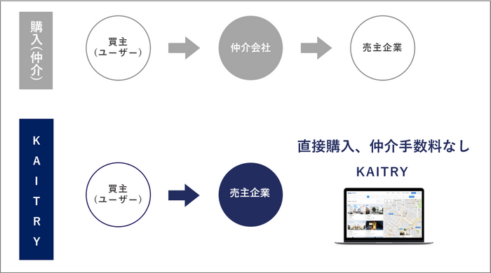 今回開設した『KAITRYリノベ物件購入』ページでは、中古マンションのリノベーションを手掛ける不動産会社が売主となって、物件購入を検討するユーザーが直接物件を購入できる「第三」(※)の選択肢を提供します。