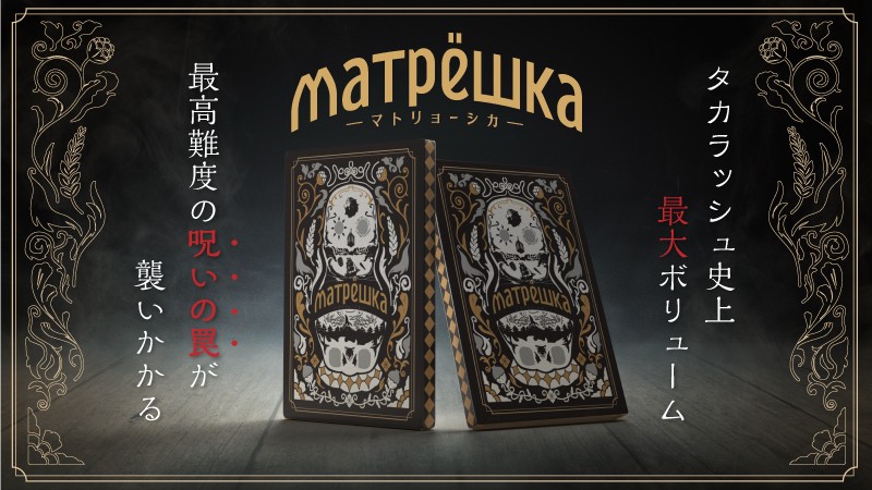 先行販売で即完売の話題作!プレイ推奨時間は驚異の240分以上?!4作品+最後の謎が一箱に入ったタカラッシュ史上最大ボリューム・高難易度の作品。あなたはマトリョーシカに込められた”呪い”を解くことができますか?