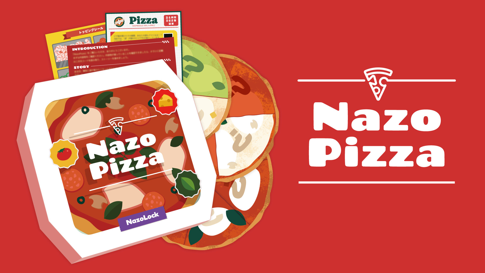 ピザの箱に入った持ち帰り謎解きセット。ピザに描かれた謎を解きながら進む、ボリュームたっぷりの内容です。