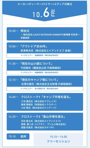 当イベントでは、業界内の横の繋がりを生み出し、アウトドア業界の今を共有し未来を創造する日として、プレス・業者デーが設けられています。6日(金)はプレスやアウトドア業界関係者の入場は無料。当日は全118ブランドの展示に加え、ステージにてアウトドア業界のレジェンド的存在 A&Fの赤津会長による講演や、穂高岳山荘 代表取締役 今田恵氏、株式会社ZEN 代表の佐久間亮介氏など業界トップランナーが集まりクロストークなどを開催します。さらに16時からは来場者全員での“乾杯タイム”!企業や業態の垣根を越え、イベント初日を盛り上げていきます。