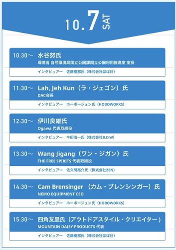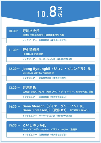 10月7日(土)、8日(日)の一般入場日には、「ELNEST CREATIVE ACTIVITY」や「Kruhi」を展開する俳優の井浦新氏や、MOUNTAIN DAISY PRODUCTS代表でアウトドアスタイル・クリエイターの四角友里氏、日本でのトークショーは初(※)となるNEMO Equipment創立者のCam Brensinger氏、MYSTERY RANCH創立者のDana Gleason氏とプロダクトディレクターのDana 3 Gleason氏の登壇が決定。その他、ogawa 代表取締役 伊川良雄氏、DAC 会長 Jake Lah(ジェイク・ラー)氏、The Free Spirits 代表取締役 Wang Jigang(ワン・ジガン)氏、HERITAGE 企画開発 野中玲樹氏、MINIMAL WORKS 代表取締役 Byeongil Jeong (ジョン・ビョンギル)氏、キャンプコーディネイター・イラストレーター・漫画家のこいしゆうか氏が登壇します。