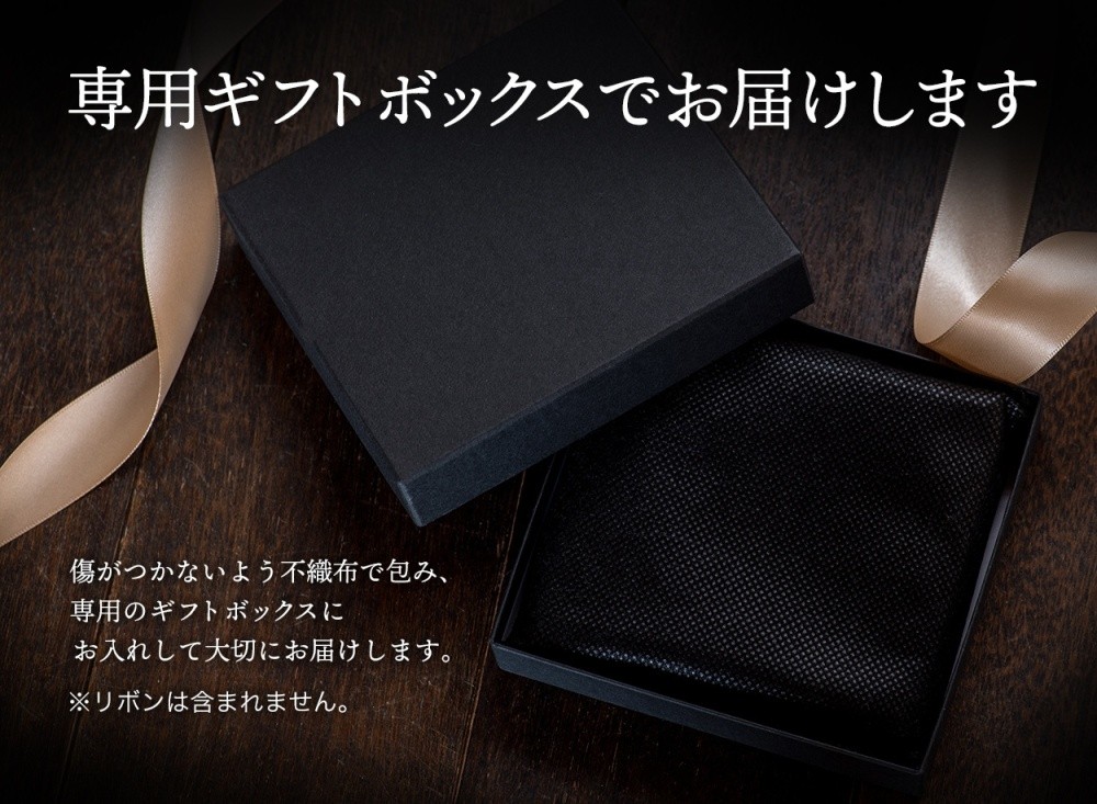 商品は傷がつかないよう不織布で優しく包み、高級感のある専用のブラックギフトボックスにお入れしてお届けします。