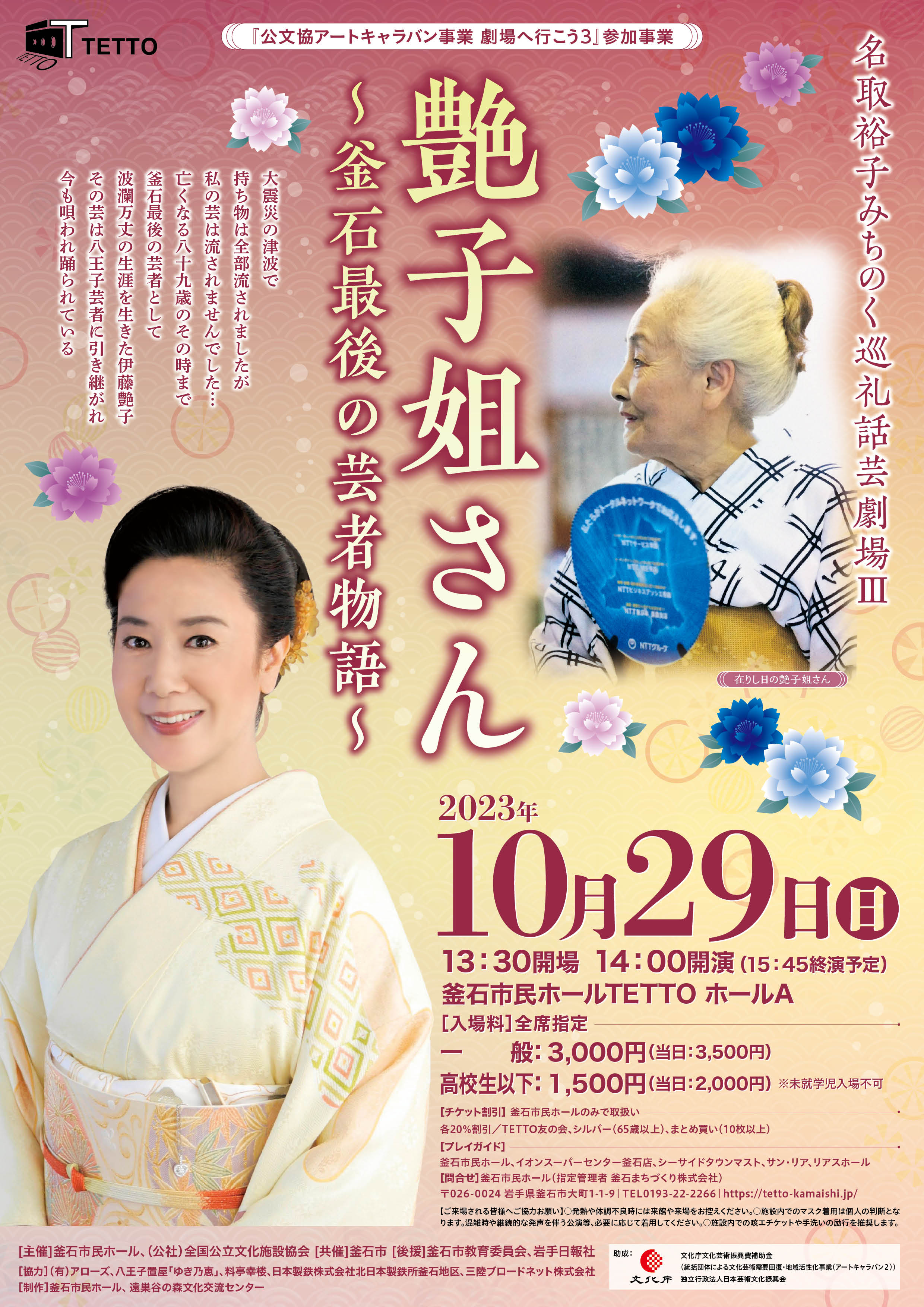 釜石市民ホール、(公社)全国公立文化施設協会主催、「名取裕子みちのく巡礼話芸劇場III『艶子姐さん』~釜石最後の芸者物語~」が10月29日(日)に釜石市民ホールTETTO ホールA(岩手県釜石市大町1-1-9)にて上演されます。