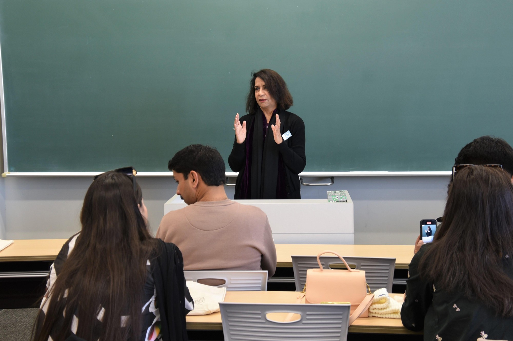 初日の25日には八事キャンパスで高谷研究室の学生8人も参加して開講式と学生交流会が行われ、薬学部の神野透人学部長が「今日はとても寒いですが、温かくおもてなしします。日本訪問をエンジョイしてください」とあいさつ。シャー学長は「日本に来るチャンスができてうれしい。いろいろなことを吸収したい」と述べ、神野学部長と高谷准教授に現地のアジュラック模様の帽子とショールをプレゼントしました。