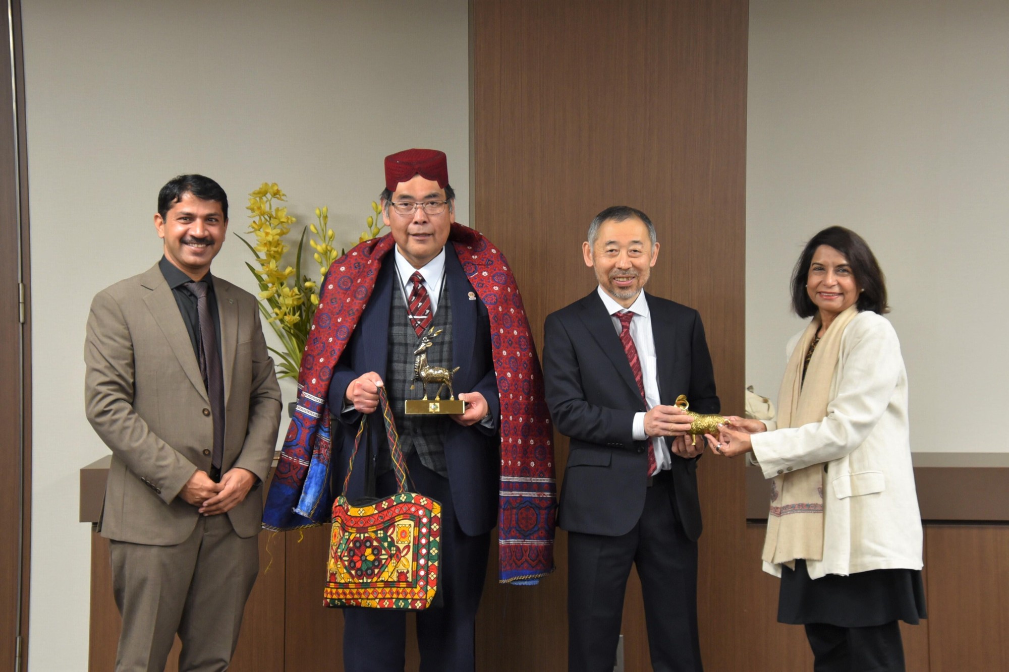 また、26日にはシャー学長と学生たちが天白キャンパス本部棟を訪れて小原章裕学長を表敬。シャー学長は「(SMBB医科大学は)地方都市にある大学であり、学生たちの可能性を広げるため、名城大学とさらなる交流をしていきたい」と学生の受け入れや研究での交流を要望。小原学長は「大学間の協定締結に向けて協議していきたい」と応じました。最後に、小原学長にもシャー学長からアジュラック模様の帽子とショール、置物が贈られました。