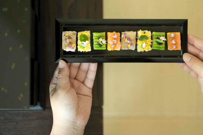 スモークサーモンとサフランライス(柚子胡椒)、アスパラとキャビアのバルサミコ酢飯(奈良漬け)