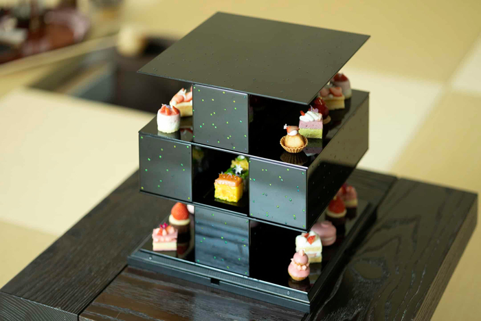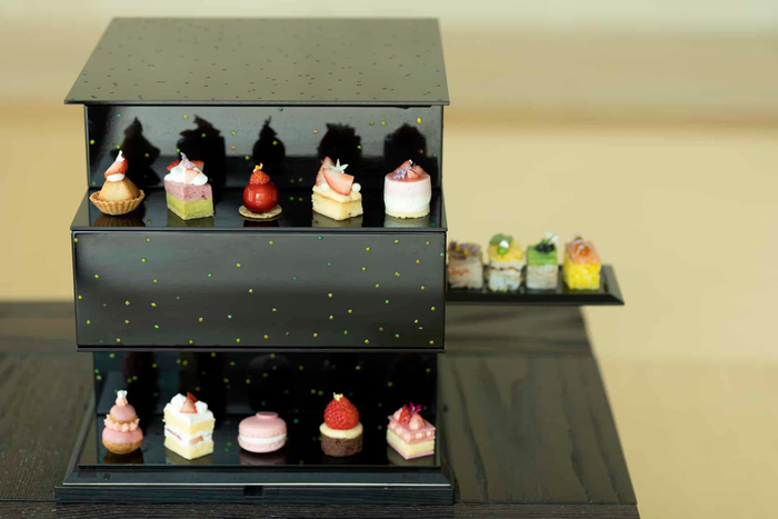 古くから濃茶の菓子器として、縁高(ふちだか)のお重が使われてきました。本アフタヌーンティーでは、玉虫細工を施したオリジナルの重箱で提供します。漆塗りのお重には、1mm四方にカットされた玉虫の羽が散りばめられ、目を奪われるほどの輝きを放ちます。玉虫細工は、古代の日本建築を知る上で重要な遺品である法隆寺の玉虫(厨子(たまむしのずし)にも使われ、推古天皇の御物(ぎょぶつ)と言われてきました(*2)。約1300年もの時を越えて人々を魅了する玉虫の羽をあしらったこだわりの重箱を前に、優雅なひとときを過ごせます。