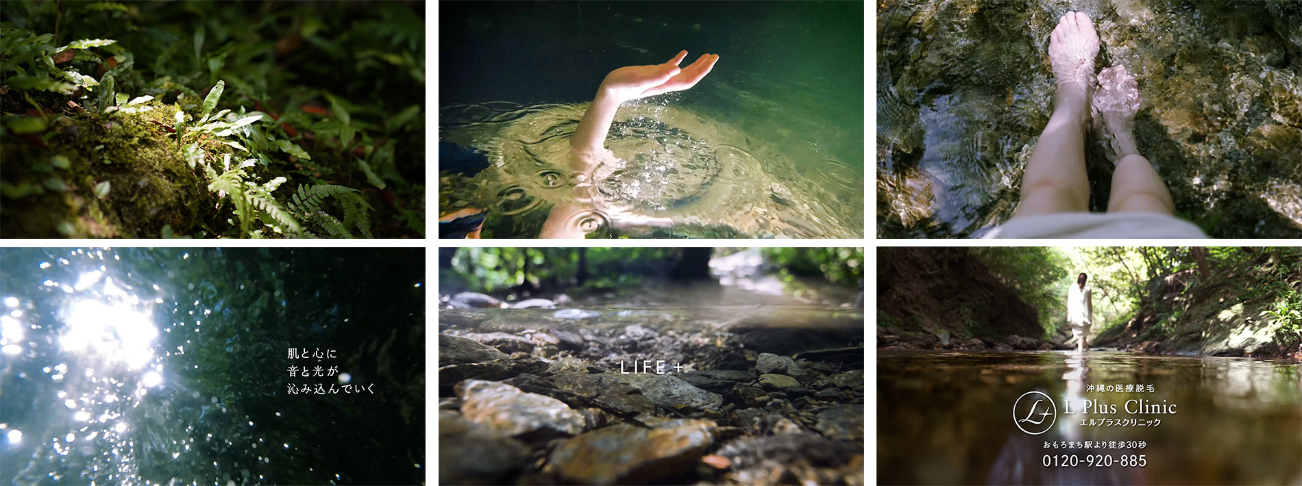 「LIFE+」“日々の生活をプラスに”というエルプラスクリニックの想いを自然の中で水と光の風景を通して表現。曲を使用せずフィールドレコーディングによる環境音(アンビエントサウンド)のみを利用しています。