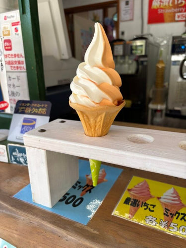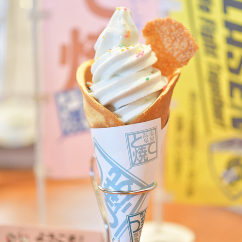 塩原温泉の名物であるとて焼と塩原のおいしい野菜を使ったソフトクリームを組み合わせた「いちごソフトとて」。ザクザクコーンとは違ったふわふわ生地のとて焼ソフトクリームをぜひ味わってみてください。(栃木県那須塩原市塩原747)