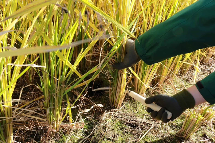 施設に隣接する田んぼで育った稲穂を収穫します。稲穂は「稲刈り鎌」を使用し、1株ずつ手刈りします。手刈りした稲は、10株程度をひとまとめにして、藁を使って束ねます。