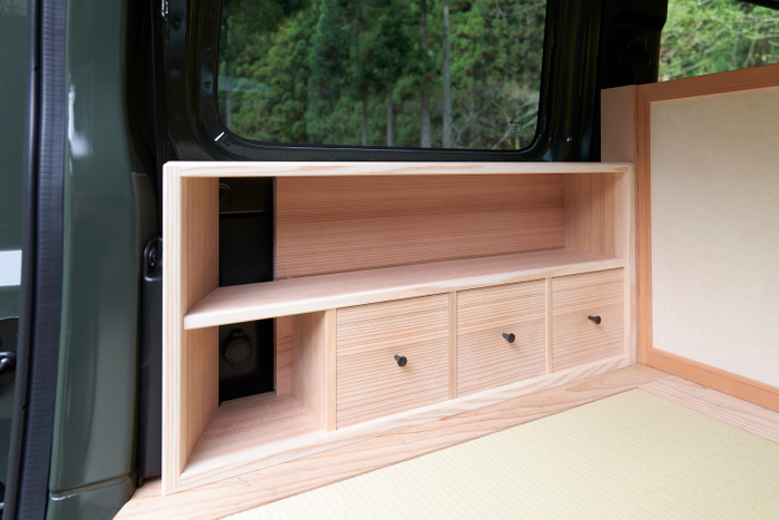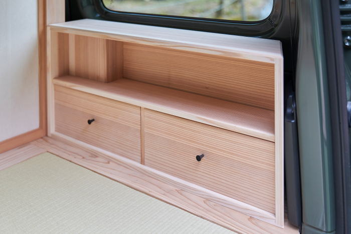 左右の棚は、京都の杉で柾目を使用。湿気がこもりやすい車内でも木の収縮による狂いを少なくするための工夫です。シガーソケットにIHコンロなどをつなぐことで出先でもお湯を沸かし一服をお楽しみいただけます。