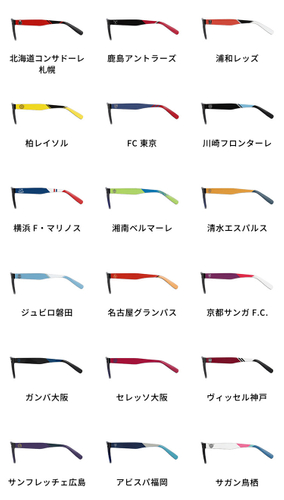 サングラスは各クラブの特色ある色とエンブレムをデザインに取り入れ、クラブとの一体感を高めるよう設計されています。紫外線の量に応じてレンズの色調が変化する調光レンズを採用しており、屋内では普通のメガネとして、屋外ではサングラスとして使用できます。また、Jリーグロゴが入ったオリジナルの巾着も付属します。