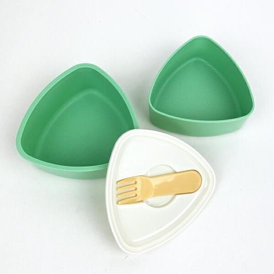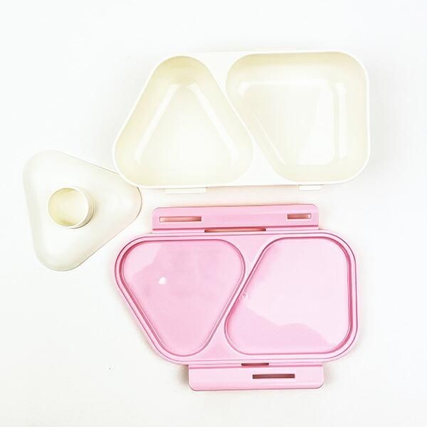 最後は三角形のおにぎりランチボックスです。ホワイトとグリーンの淡い色合いが優しい雰囲気を出しています。