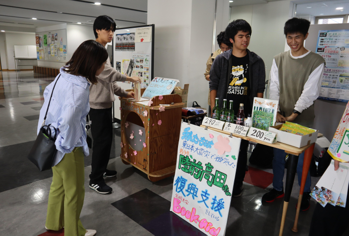 東日本大震災で大きな被害を受けた岩手県陸前高田市の復興支援に取り組み、「Enjoy Learningプロジェクト」に採択されている学生団体「Book-aid」が10月19日、天白キャンパスの共通講義棟北で、学内などで回収した古本や陸前高田市で仕入れた物産品を販売しました。