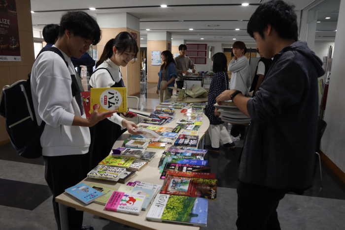 Book-aidは名古屋市西区の円頓寺商店街で開催されている「サタデーマーケット」でも出店していますが、学内での販売は今年初めてです。代表の福浦陽日希(ひびき)さん(経済学部3年)は「これを機会に私たちの活動を知ってもらい、部員を増やしてさらなる復興支援につなげていきたいです」と話していました。