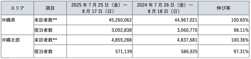 沖縄県、沖縄北部(12市町村*)の来訪者と宿泊者数は2024年と比べて2025年に大きな変化はなかった。*恩納村、名護市、本部町、今帰仁村、金武町、宜野座村、国頭村、大宜味村、伊江村、伊是名村、東村、伊平屋村