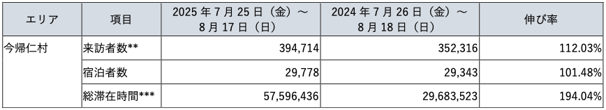 「ジャングリア沖縄」がある今帰仁村では、来訪者数は2024年と比べて112%とアップした。宿泊者数の増加は101%。今帰仁村の1日あたりの総滞在時間を2024年と比較したところ、2025年は194%と伸びがみられた。
