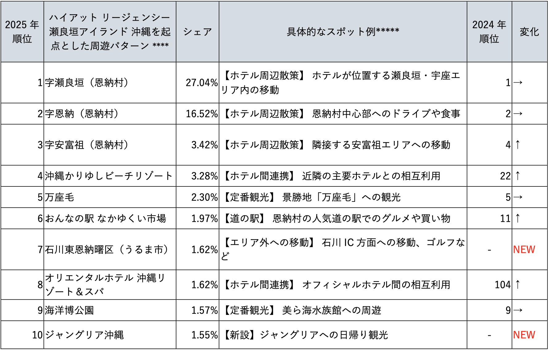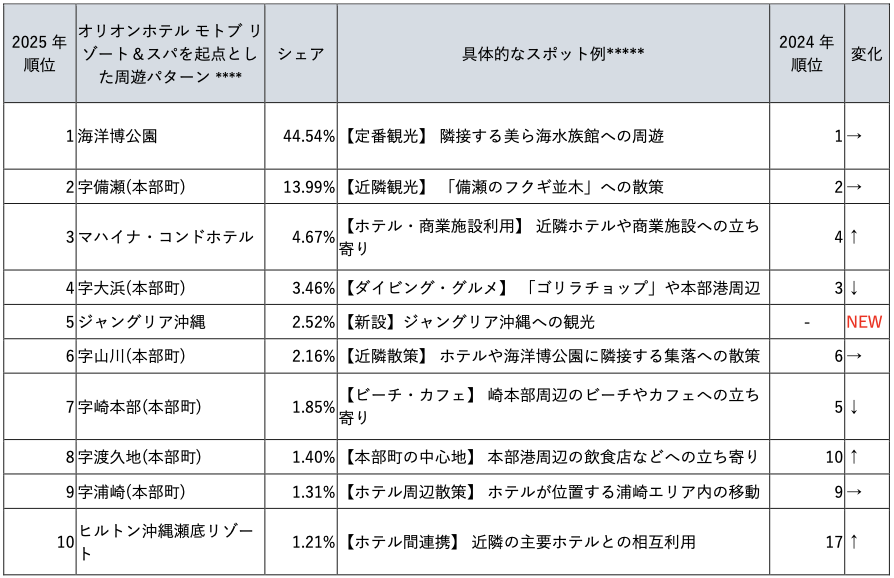 周遊先は主にホテルが位置する恩納村内の地点で占められています。2025年のランキングでは10位に「ジャングリア沖縄」が追加されました。また、同じオフィシャルホテルである「オリエンタルホテル 沖縄リゾート&スパ」との周遊が、前年の104位から8位に上昇しています。