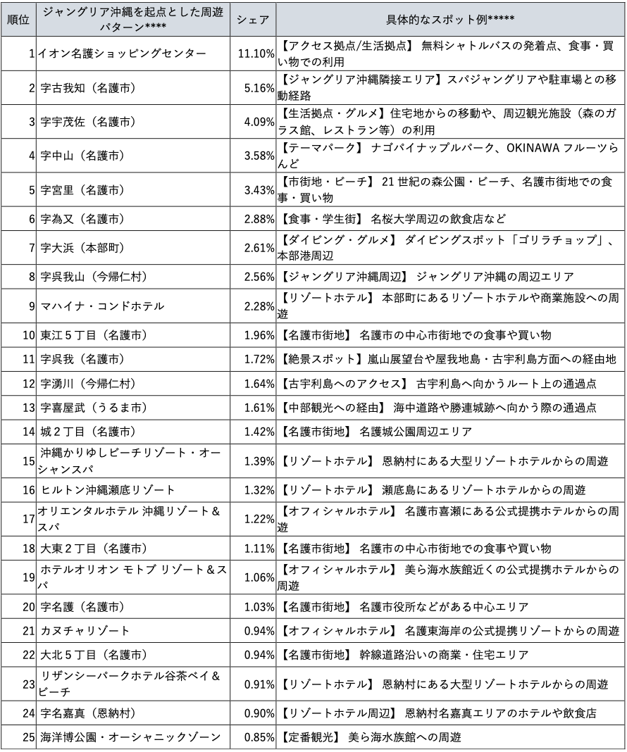 - 今回の分析では、テーマパーク「ジャングリア沖縄」の勤務者や関係者が、来訪者としてカウントされている可能性があります。