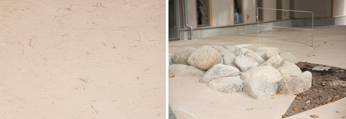 左から:“牧草”を漆喰に練りこんだ独自の壁材、掘り出した石のモニュメント