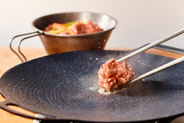 千本松牧場で育てた牛肉を100%使用した生ハンバーグを提供。目の前の鉄板で一口サイズにお好みの焼き加減に仕上げていただく、焼肉スタイルの新感覚ハンバーグです。焼きたてのジューシーな美味しさと、6種類のタレ(チミチュリソース・トマトソース・わさび・塩・ごま油・ポン酢)で楽しむ多彩な味わいが楽しめます。