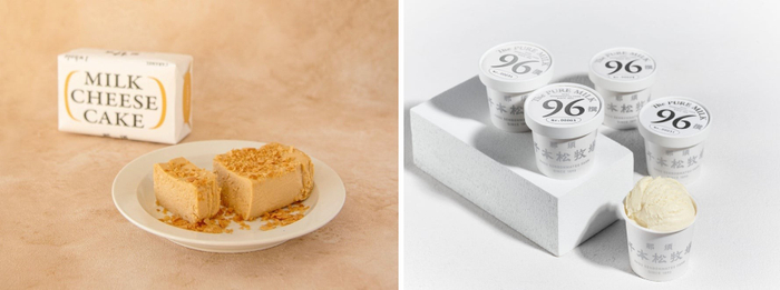 左から:牧場手づくりミルクチーズケーキ(キャラメル岩塩)、千本松牧場96撰アイスクリーム