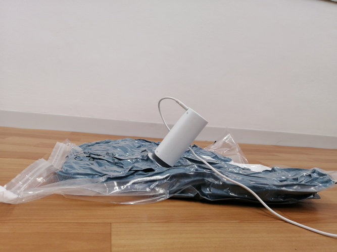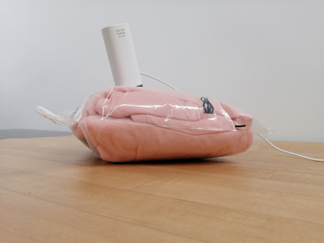 本体サイズわずか約 11cm、重さ約 150g の超小型・超軽量タイプの衣類圧縮器です。