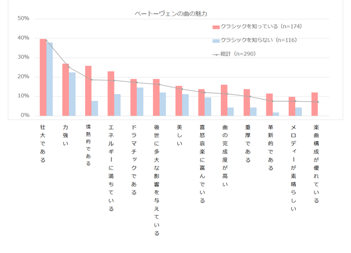 まず、ベートーヴェンの曲の魅力は「壮大である」「力強い」が上位となりました。やはり、ベートーヴェンはスケールの大きさや力強さが評価されているようです。また、クラシックを知っているかどうかで評価項目に差があり『クラシックを知っている』人は、知らない人より、「曲の完成度が高い」「楽曲構成が優れている」が高くなり、音楽面での評価が高いことが伺える結果となりました。
