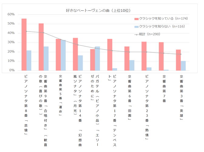 続いて、好きなベートーヴェンの曲を聞いたところ、全体では、「ピアノソナタ第8番「悲愴」」「交響曲第九番「合唱付き」(歓喜の歌(喜びの歌))」「交響曲第5番「運命」」がトップ3となりました。