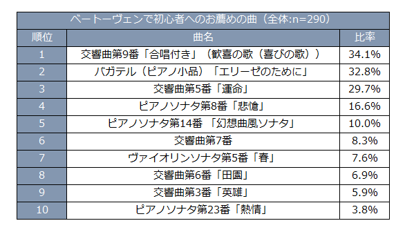 しかし、クラシックの認知度別で聞いてみると大きな違いが見られました。『クラシックを知らない』では、「交響曲第5番「運命」」「交響曲第9番「合唱付き」(歓喜の歌(喜びの歌))」「バガテル(ピアノ小品)「エリーゼのために」」と誰もが知っている有名な曲が上位にきました。