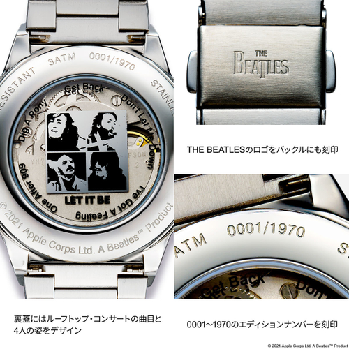 裏蓋にはルーフトップ・コンサートの曲目と4人の姿をデザイン。限定1970点の証であるエディションナンバーが刻印されます。