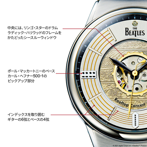 文字盤は4人が立ったルーフトップのステージをイメージした木目調のエンボス加工。中央はリンゴ・スターのドラム、ラディック・ハリウッドのフレームをかたどったシースルーウィンドウとなっています。