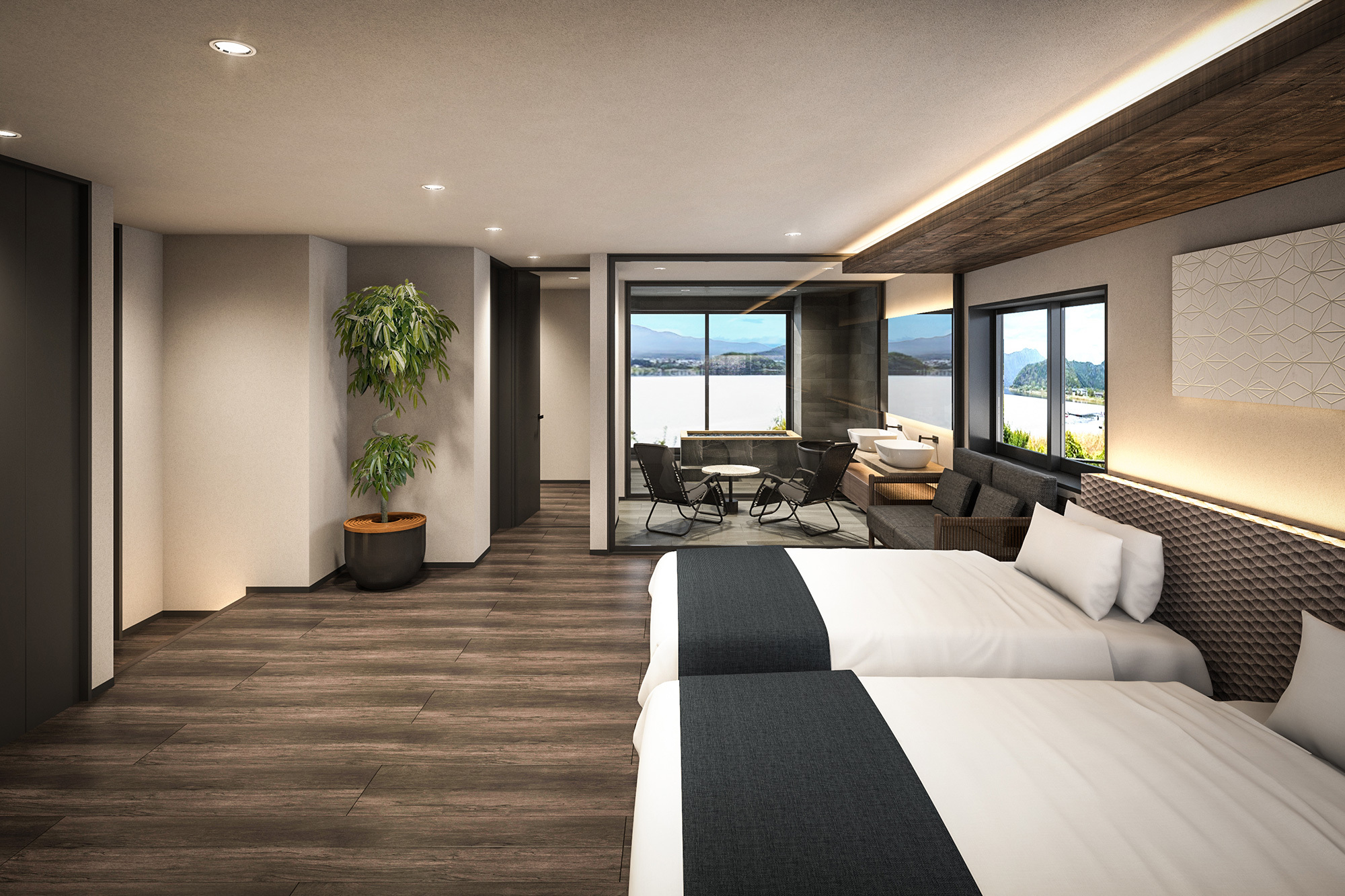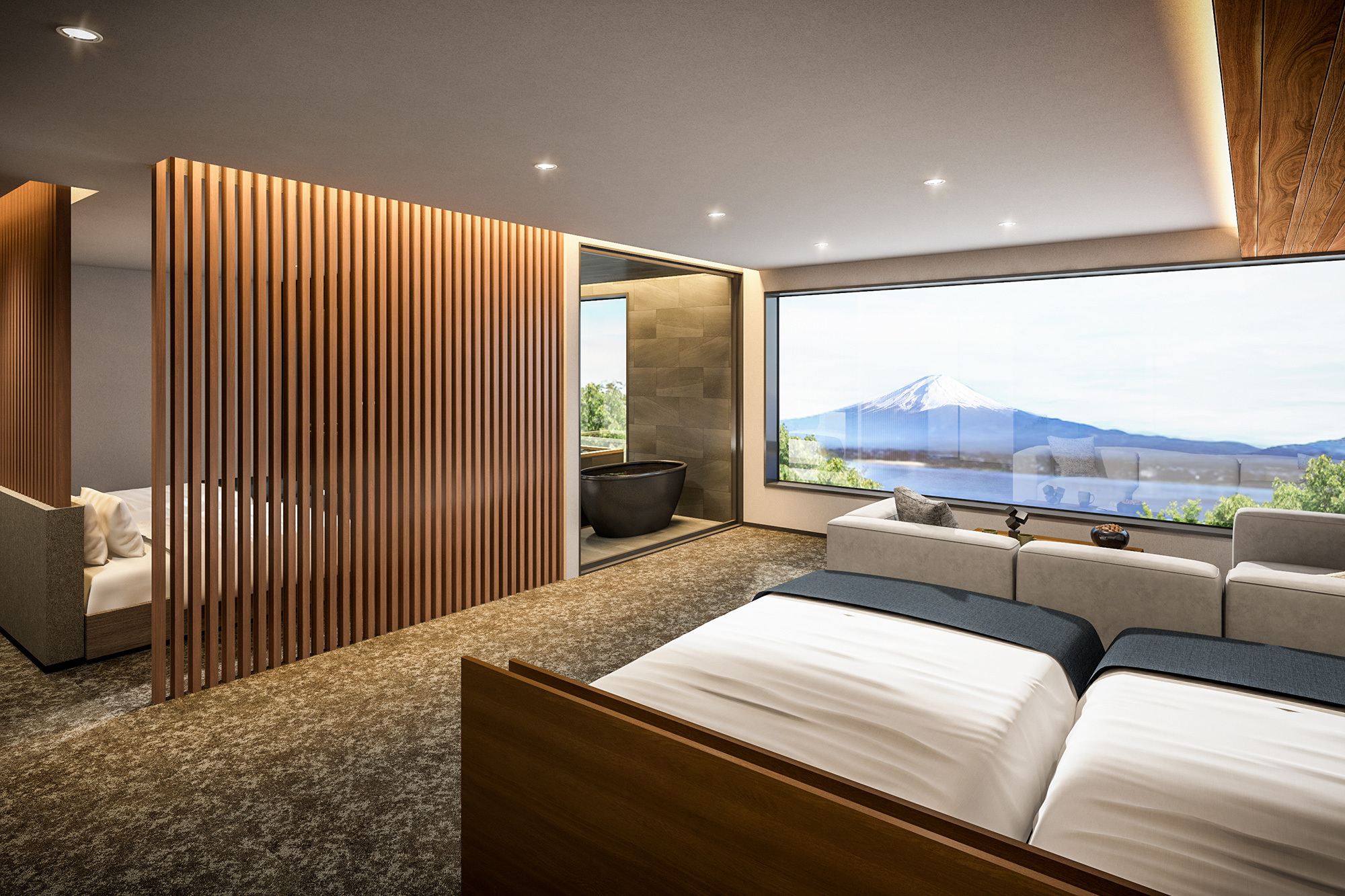 個別にプライベートサウナが完備されたスーペリアタイプのお部屋。富士山と河口湖の眺望を楽しみながら、心と体がほぐれていくひとときをお楽しみいただけます。