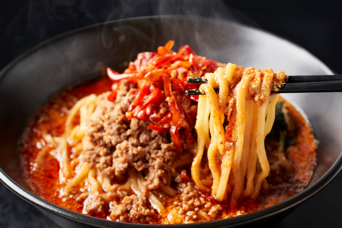 (1)訪れる担担麺・激辛マニアたちの心を掴んで離さない「地獄の担担麺天竜」がいつでも、どこでも食べられて、お店の味をそのまま味わっていただけるよう改良を重ねました。瞬間冷凍することで、湯煎で解凍し、麺を茹でるだけで完成する満足の1品になっております。