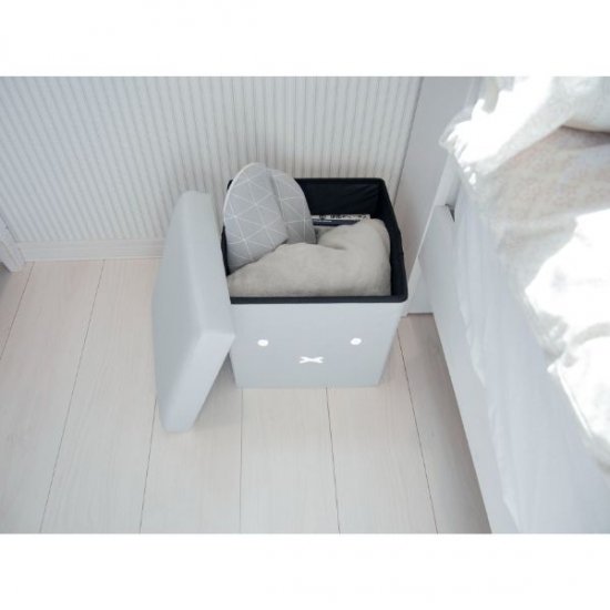 グレーの本体にお顔がデザインされた、シンプルでちょっぴり大人なアイテム。収納スツールとして使用でき、28.5cm×28.5cm×28.5cmnの程よいサイズ感も魅力です。