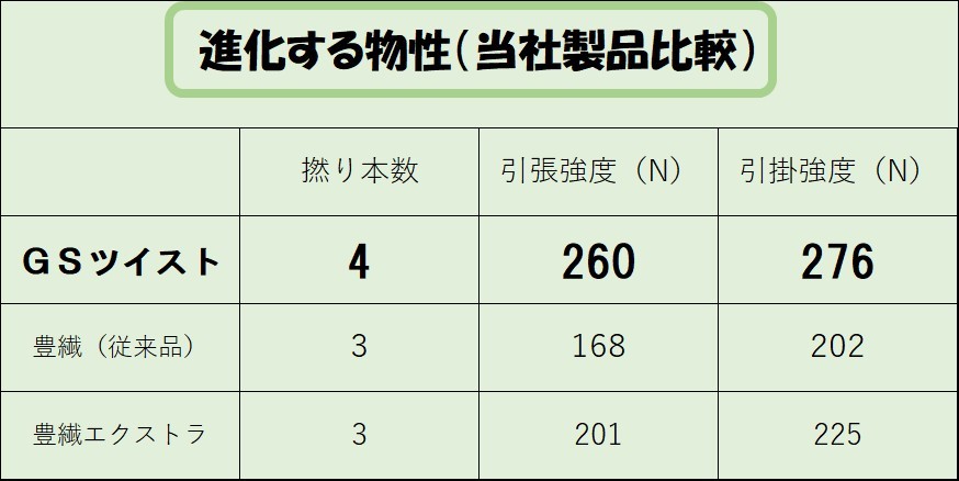 ※引張強度 1本の糸を両サイド方向に張力をかけ続け、破断(限界点)した地点の数値。