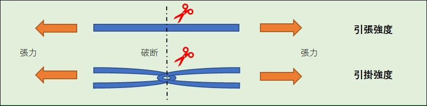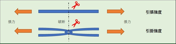 ※引掛強度 2本の糸をループ状に交差させ、両サイド方向に張力をかけ続け、破断(限界点)した地点の数値。