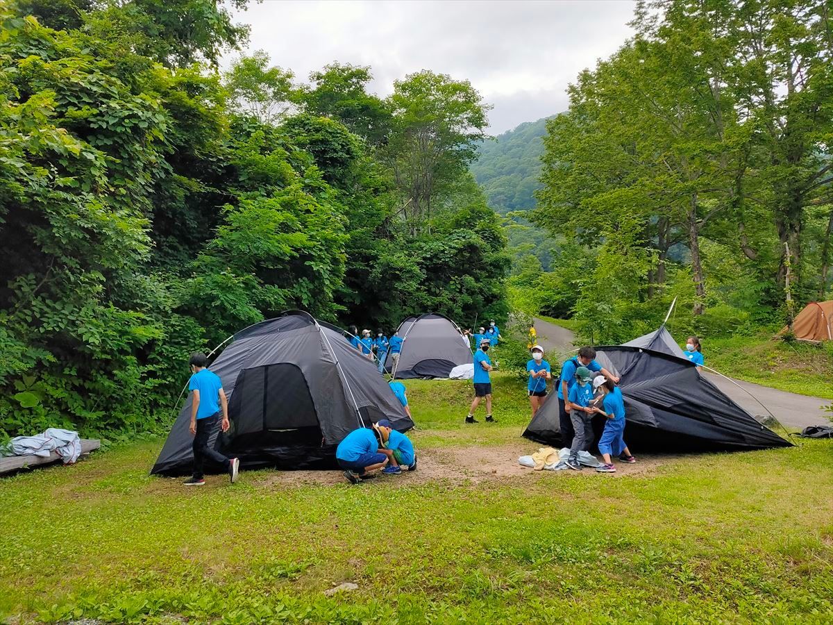 初めての仲間たちとチームビルディングを行い、5人程度のチームに分かれて行動します。テントを立てたりごはんを作ったり、全て自分たちで行うことで「生きるチカラ」を養います。