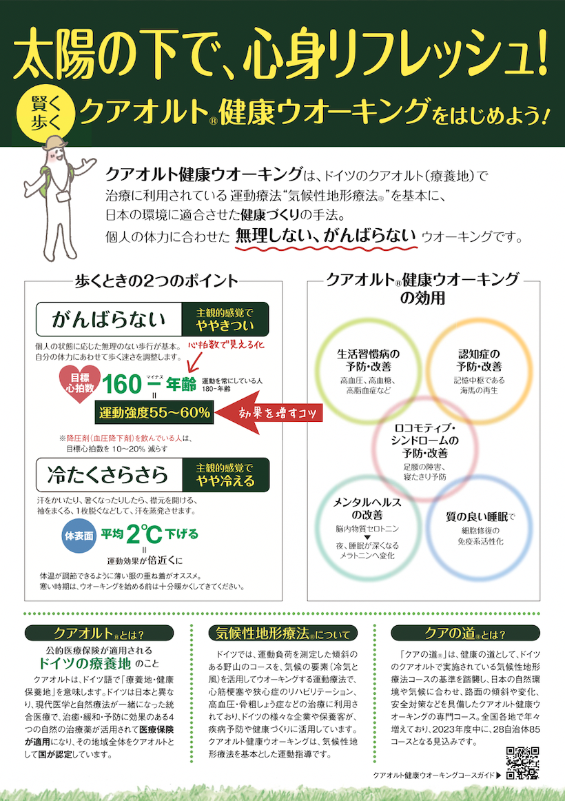 ドイツのクアオルト(療養地)で治療に利用されている運動療法“気候性地形療法”を基本に、日本の環境に適合させた健康づくりの手法です。