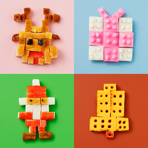 今回は、「ピクセルアートトナカイ」や「ブロックギフトボックス」など、練り製品をスクエアにカットし、ピクセルアート(ドット絵)風のオーナメントやブロックのようなクリスマスグッズを表現しました。お子さまと一緒にキッチンバサミやストローを使って型取りするのも楽しいですね!クリスマスメニューを華やかに彩ること間違いなしの“ねりデコ”です。