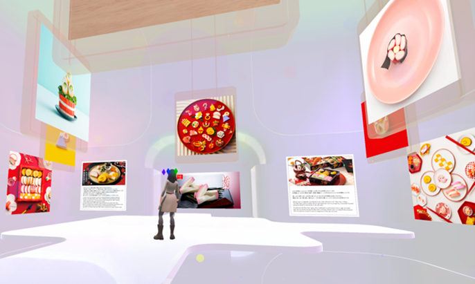 物理的な制限を超えたバーチャル空間『おせち“ねりデコ”ワールド』では、自由な発想で、練り製品の飾り切りで様々なキャラクターやモチーフを表現した“ねりデコ”やおせちの世界を体験していただけます。この空間では、生成AIから生まれた“ねりデコ”の展示ギャラリーや、バーチャル空間を歩いたりジャンプしたりしながら“ねりデコ”おせちを集めて、制限時間内に重箱を埋めるゲームなどがお楽しみいただけます。