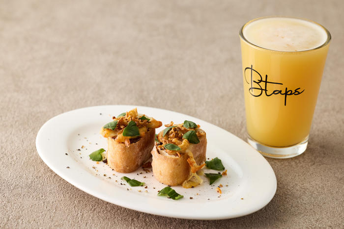 AWATAMAオニオンスープを使った卵液に漬けて焼いた、ふわふわ食感のバゲット。さらに、チーズと自家製ミートソースを和えたずわい蟹をのせて焼き上げられ、AWATAMAオニオンスープの甘味が引き立つ贅沢な味わいに仕上がっている。