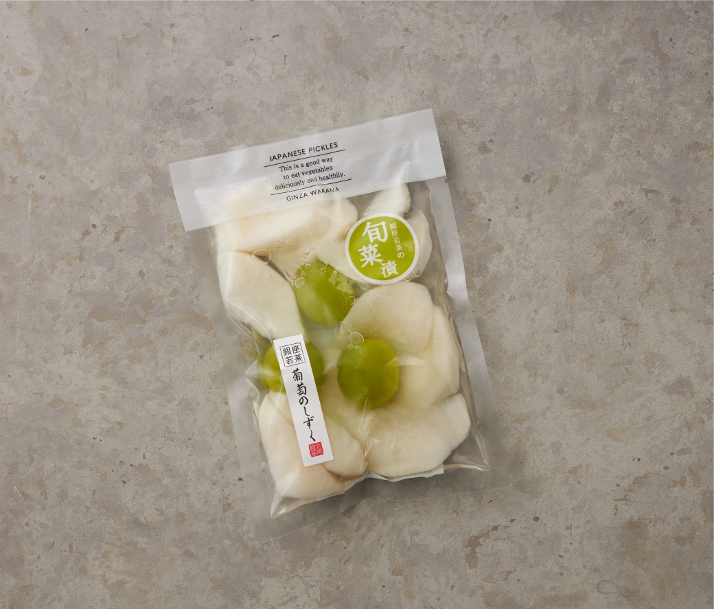 香り高いシャインマスカットとさくさくの皮付き大根を、白ワインベースの甘酢でさっぱりとした浅漬けに仕立てました。