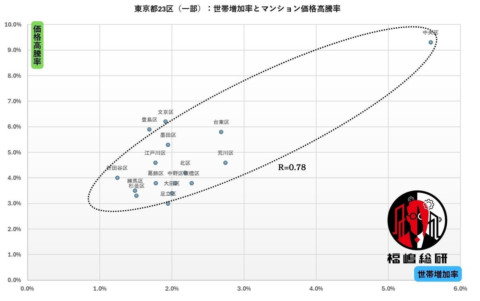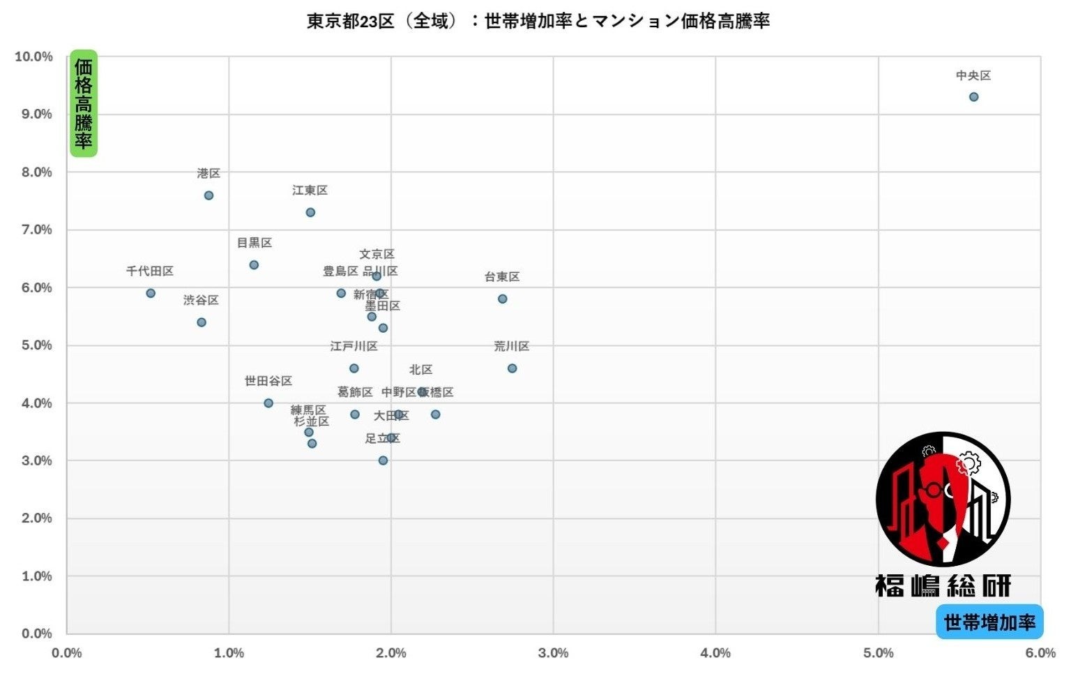 まず、以下のグラフ1では、東京都23区それぞれの「世帯増加率」と「マンション価格の平均高騰率」を散布図で示しています。