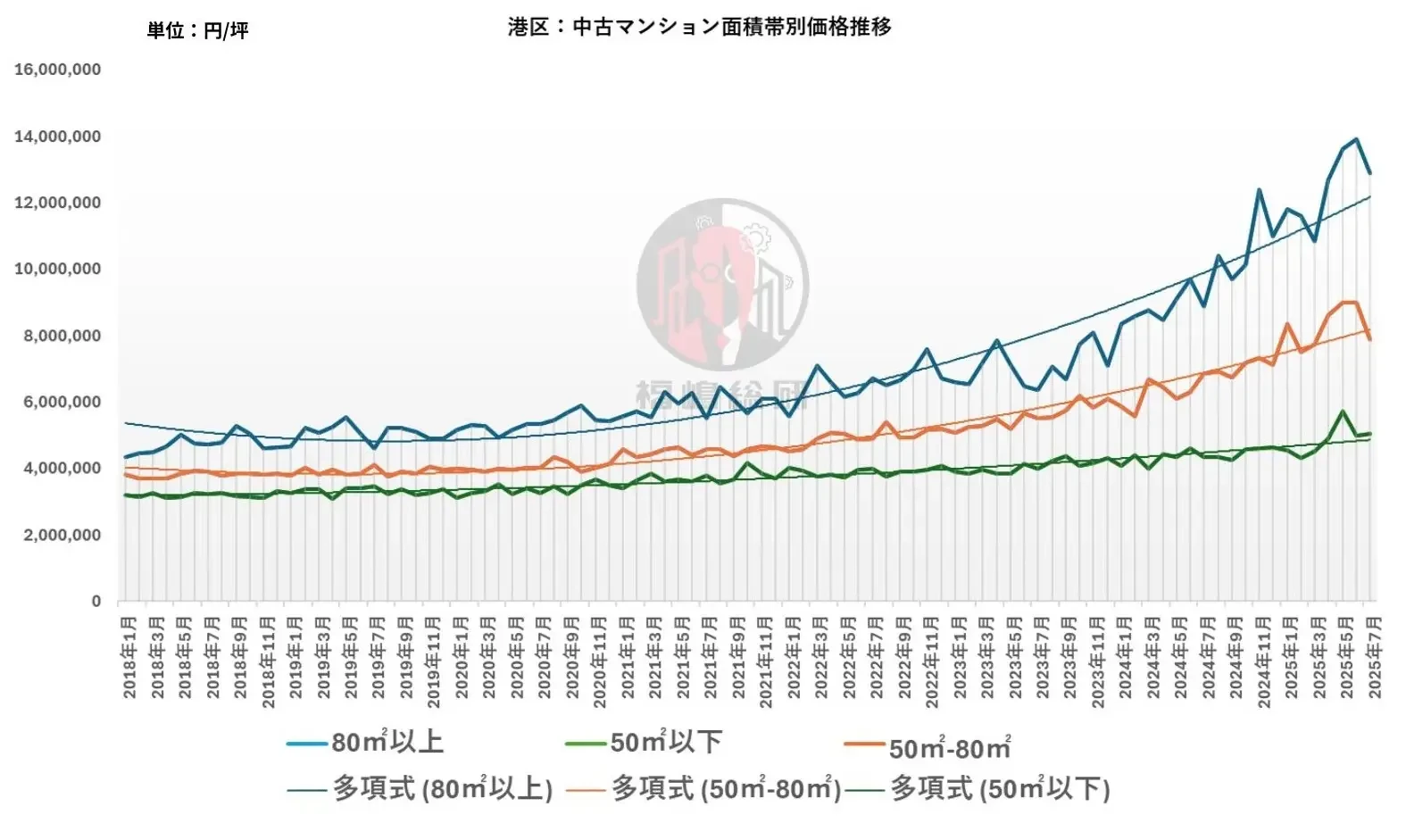 2018年1月時点では各面積帯の坪単価に大きな差はなかったものの、2025年7月には80㎡以上の物件が他の面積帯を大きく引き離す結果となりました。これは広い住戸を求める層が国内外の富裕層や投資家であることを示しており、彼らの購買力と希少性が価格を押し上げています。