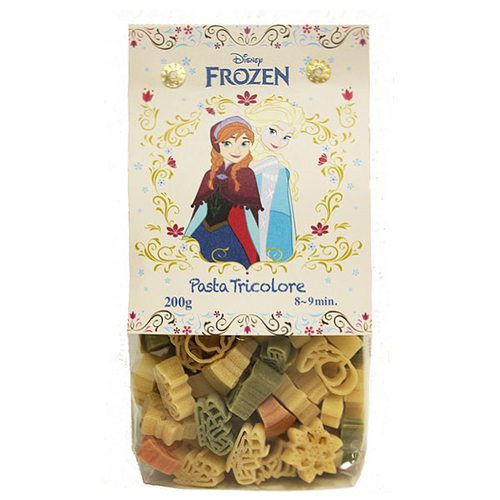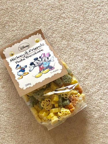 ミッキー・ミニー・ドナルド・デイジー・プルート・グーフィー・スクルージの形をした3色のかわいいショートパスタ。