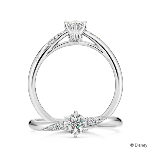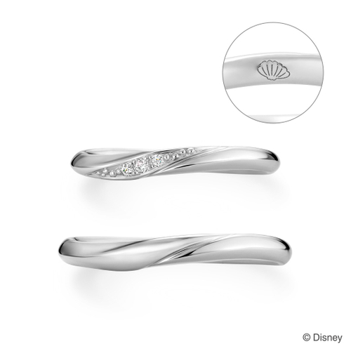 婚約指輪は、波を思わせるダイヤモンドの流れを美しくデザイン。側面には「貝殻」モチーフをさりげなくしのばせています。リング内側には、光に向かって泳ぐ「アリエル」のシルエットを刻印し、物語の象徴的なシーンを表現しています。