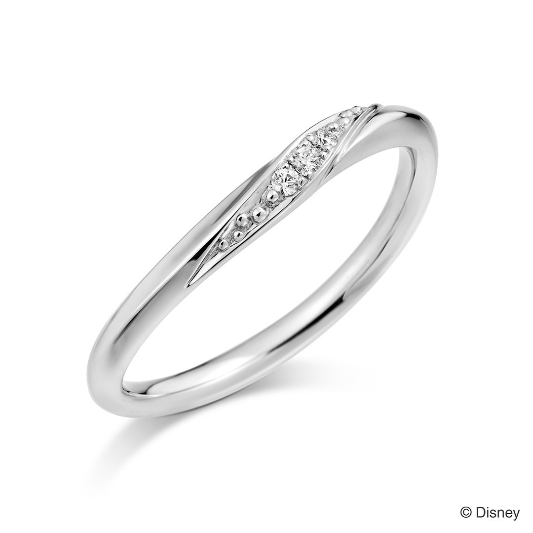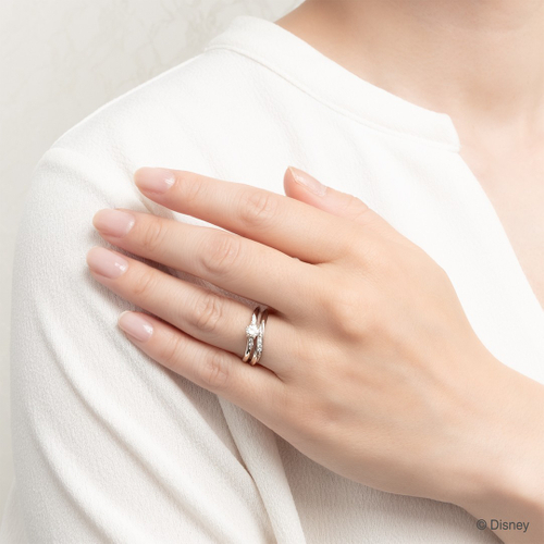 結婚指輪は、「アリエル」が『パート・オブ・ユア・ワールド』を歌うシーンをイメージしたデザインです。射しこむ光のようにダイヤモンドが輝き、さらにダイヤモンドの留め終わり部分、小さな金属の粒をあえて揺らぎのある並びにすることで“泡”に見立て、海の情景を描いています。ケイウノでは、『リトル・マーメイド』をテーマにしたブライダルリングは『A mermaid in love』『Ariel -Your World』『Light in the sea』に続く第四弾となります。